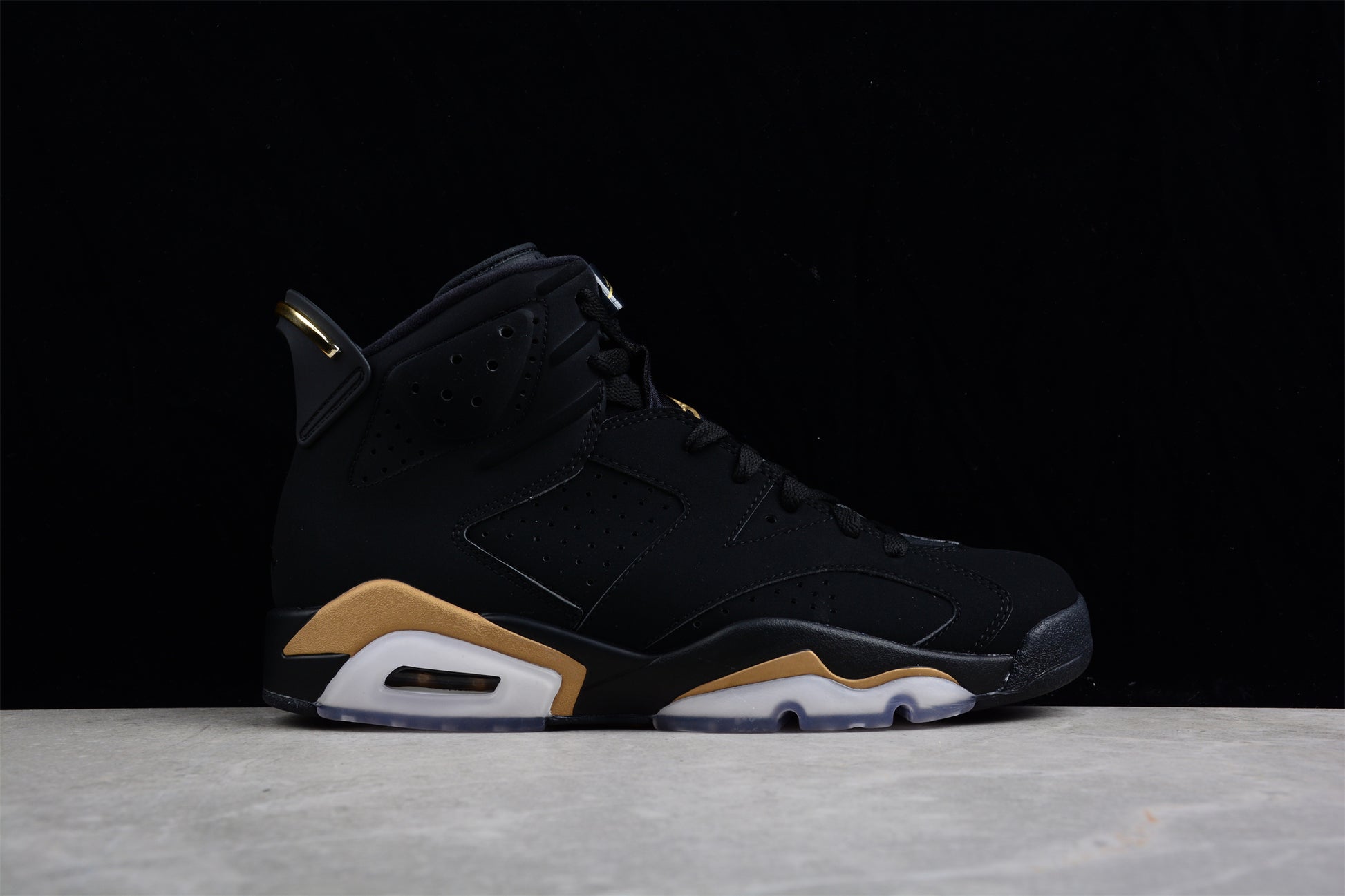 A golden celebration of greatness. The Air Jordan 6 DMP Retro AJ6 CT4954-007 revives the legendary “Defining Moments Pack” edition, combining sleek black nubuck with metallic gold accents, symbolizing Michael Jordan’s first championship glory 🏆✨